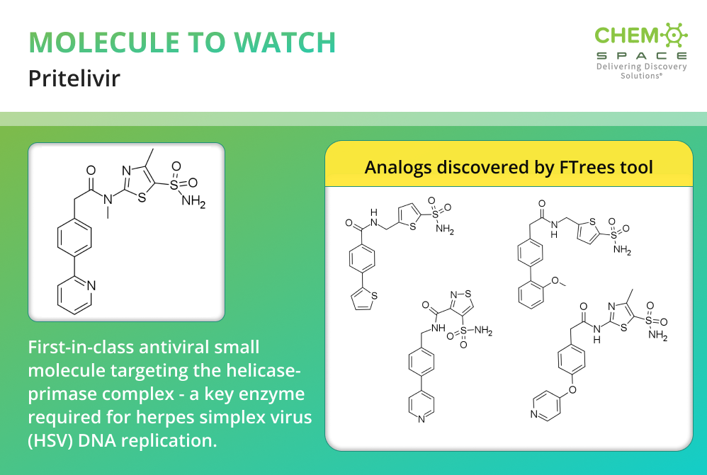 Here, we showcase analogs of pritelivir that were generated using this method in just seconds, illustrating how quickly Chemspace enables exploration of the chemical space around clinically relevant molecules.