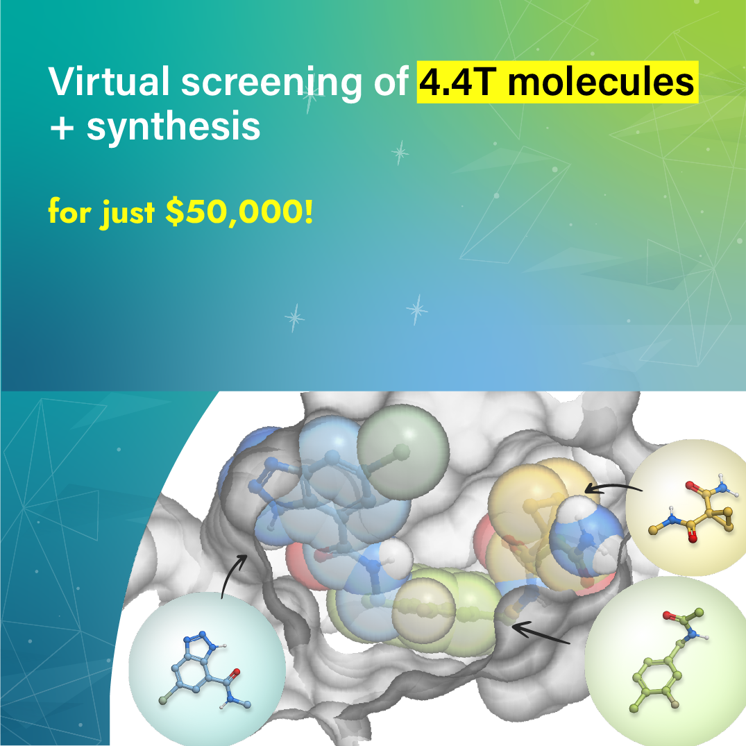 Fragment-based virtual exploration of the entire 4.4T Enamine xREAL Space using V-SYNTHES, delivering 200 selected synthesized hit compounds - all for just $50,000.