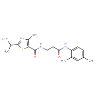 Supplier Lead time Price, $ Pack ChemBridge Corp.Ships from: United StatesTo:14 days 68.201 mgDescription: Name: N-{3-[(2,4-dimethylphenyl)amino]-3-oxopropyl}-2-isopropyl-4-methyl-1,3-thiazole-5-carboxamide; Stereochemistry: achiral; Compound state: dry filmFor a custom pack size or bulk