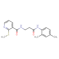 Supplier Lead time Price, $ Pack ChemBridge Corp.Ships from: United StatesTo:14 days 68.20 Description: Name: N-{3-[(2,4-dimethylphenyl)amino]-3-oxopropyl}-2-(methylthio)nicotinamide; Stereochemistry: achiral; Compound state: dry filmFor a custom pack size or bulk