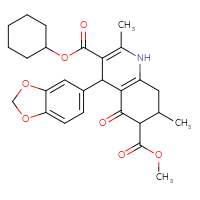 Supplier Lead time Price, $ Pack Princeton Biomolecular ResearchShips from: United StatesTo:10 days 88.00 ChemBridge Corp.Ships from: United StatesTo:14 days 68.20 Description: Name: 3-cyclohexyl 6-methyl 4-(1,3-benzodioxol-5-yl)-2,7-dimethyl-5-oxo-1,4,5,6,7,8-hexahydro-3,6-quinolinedicarboxylate; Stereochemistry: unknown; Compound state: solidFor a custom pack size or bulk