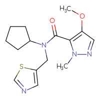 IUPAC Name:N-cyclopentyl-4-methoxy-1-methyl-N-[(1,3-thiazol-5-yl)methyl]-1H-pyrazole-5-carboxamideFor a custom pack size or bulk
